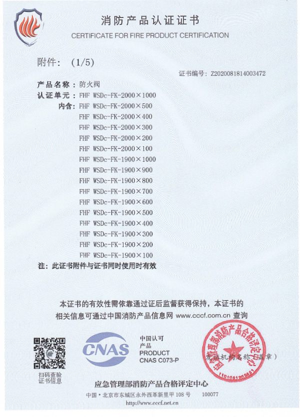防火閥認證證書2000X1000